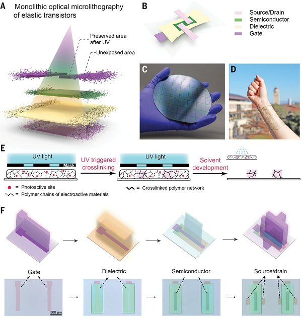 聚合物电子材料使柔软且可拉伸的电子产品成为可能。然而,由于缺乏用于类皮肤和弹性电路的通用微/纳米制造方法,导致设备密度低,并且与硅基设备相比,并行信号记录和处理能力有限。近期,斯坦福大学鲍哲南团队提出了一种单片光学微光刻工艺,该工艺通过连续紫外光触发溶解度调制,直接对弹性电子材料进行图案化。研究人员制作了沟道长度为2 μm的晶体管,密度高达42000个晶体管/每平方厘米。基于该方法还构建了包含异或门和半加法器的弹性电路。该工艺为实现复杂、高密度、多层弹性电路的晶圆级制造提供了思路,且性能可与刚性电路相媲美。该研究成果以“Monolithic optical microlithography of high-density elastic circuits”为题发表在《Science》上。