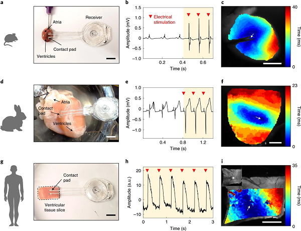 图4生物可吸收心脏起搏器在小鼠和兔心脏以及人类心脏组织上的体外演示