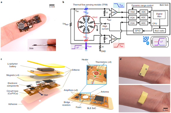 6. Nature Electronics: 用于实时无线监测汗液流量、累积损失和温度的皮肤平台