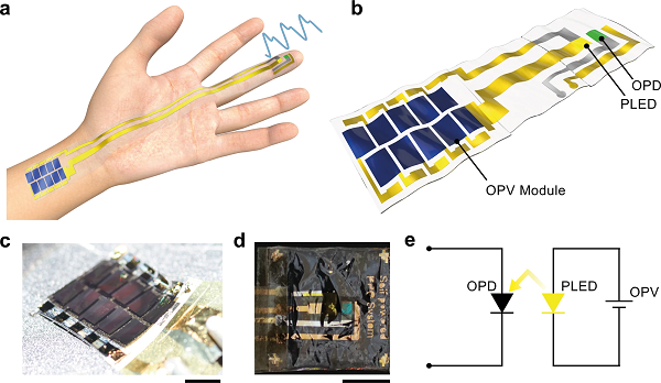 超柔性光学器件由于其对人体皮肤的出色贴合性,已广泛用于下一代可穿戴电子产品。长期健康监测还需要将超柔性光学设备与能量收集电源集成在一起;使设备自供电。然而,由于超柔性聚合物发光二极管的空气操作稳定性不足,超柔性光学传感器与电源的系统集成具有挑战性。近期,日本东京大学Takao Someya教授团队制备了倒置结构的超柔性聚合物发光二极管器件,并对器件的电子传输层进行掺杂,大大提升了器件的空气稳定性。并将发光二极管、有机太阳能电池和有机光电探测器集成,构筑了超柔性自供电有机光学系统,实现了对血管容积图(photoplethysmogram)的监测。相关研究成果以“Self-powered ultraflexible photonic skin for continuous bio-signal detection via air-operation-stable polymer light-emitting diodes”为题,发表在Nature Communication上。
