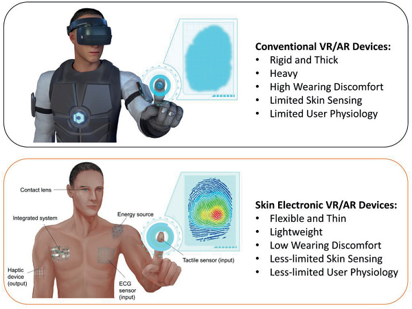 图8传统和皮肤电子 VR/AR 设备的示意图及其比较