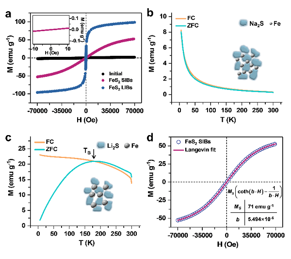 图4 FeS2锂/钠离子电池放电到零伏附近时的磁性表征