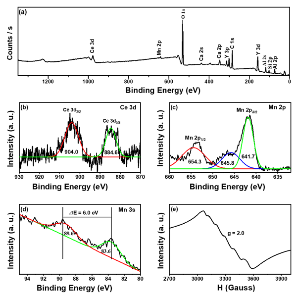 图2 CYAS:0.02Ce,0.30Mn的XPS谱(a),Ce3d的高分辨XPS谱(b),Mn2p的高分辨XPS谱(c),Mn3s的高分辨XPS谱(d)和CYAS:0.02Ce,0.05Mn中Mn的EPR(e)。