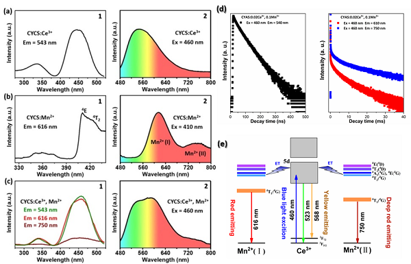 图3 CYAS: Ce3+的激发和发射光谱图(a),CYAS: Mn2+的激发和发射光谱图(b),CYAS: Ce3+,Mn2+的激发和发射光谱图(c),Ce3+和Mn2+在CYAS:0.02Ce3+,0.1Mn2+中的荧光寿命衰减曲线图(d)和Ce3+-Mn2+之间的能量传递示意图(e)。