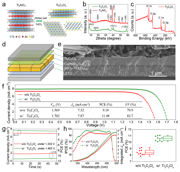 (f)Ti3C2Clx优化前后电池器件的J-V曲线。