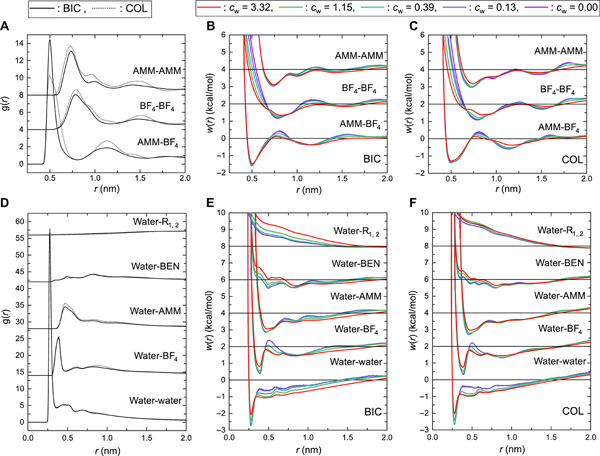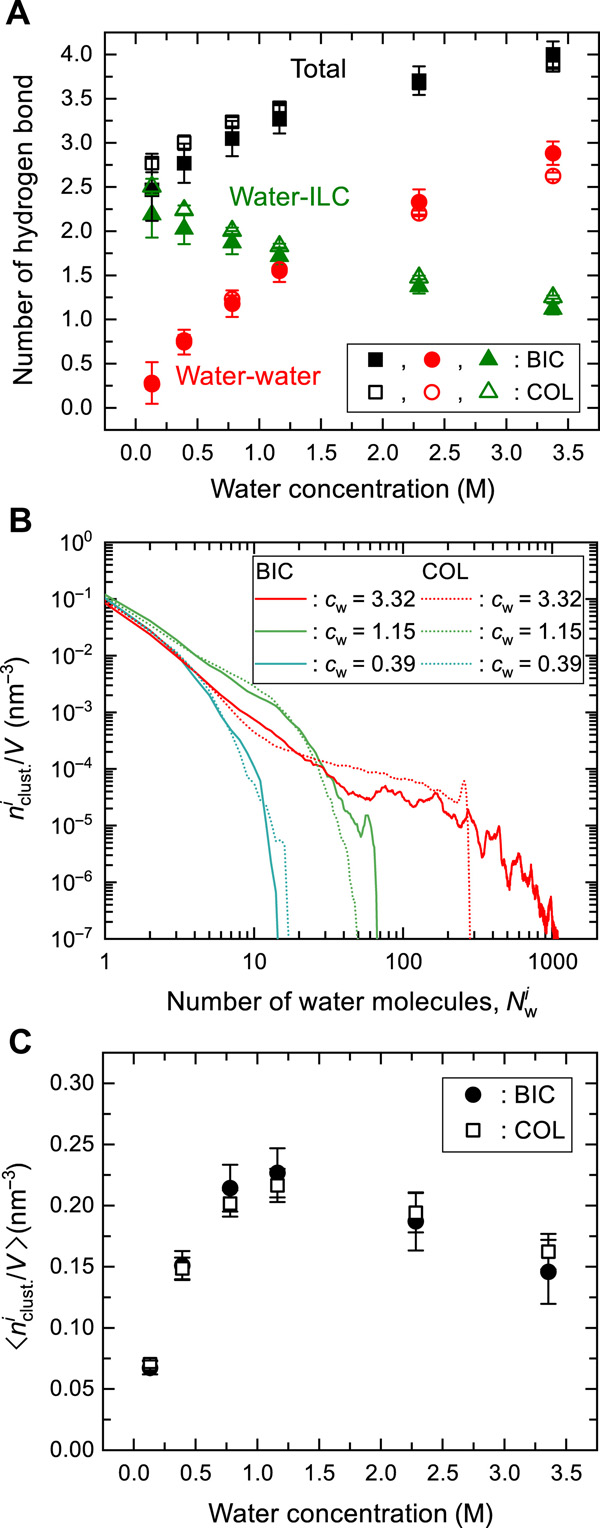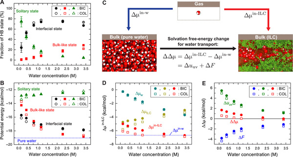 (A)标记水分子的氢键(HB)状态分数和(B) ILC中的溶质-溶剂势能。氢键态分为孤立态、界面态、体积态和疏水态四种模式。