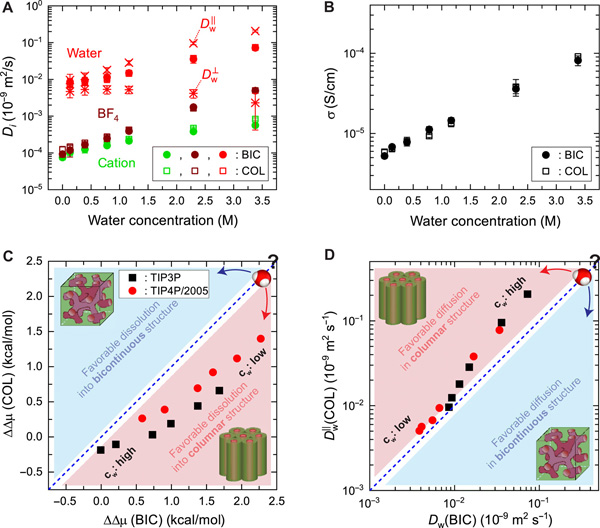 (A)用OPLS-DFT和TIP3P进行MD计算得到的铵基阳离子、BF4阴离子和水分子的自扩散系数和(B)双连续和柱状结构的离子电导率。
