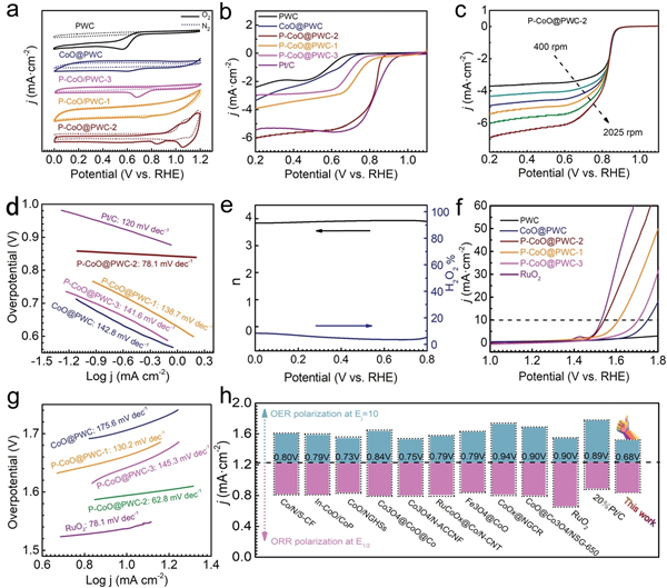 (e)不同电位下,P-CoO@PWC-2的电子转移书n和H2O2产率(%);