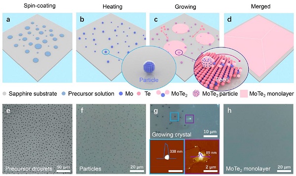 图一、由固定化前驱体颗粒驱动的二碲化钼单层生长示意图