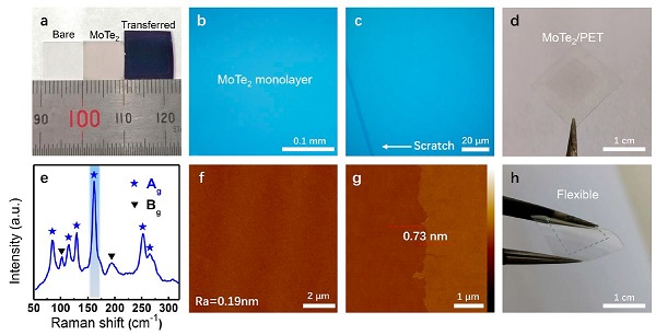 (g)AFM图像显示二碲化钼单层的厚度为0.73纳米;