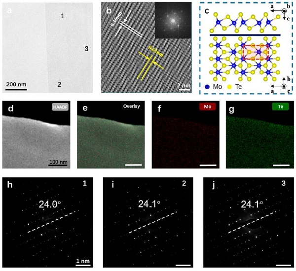 (d)二碲化钼晶体的HAADF图像以及相应的重叠(e)、钼(f)、碲(g)的EDS分布;