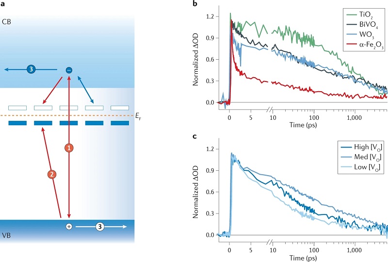 太阳能催化是合成低碳燃料的一条很有前途的途径。研究这些太阳能燃料最广泛的直接方法是光电化学(PEC)或光催化(PC)分解水,生成绿色氢和分子氧。自20世纪70年代提出使用TiO2进行PEC分解水的概念以来,金属氧化物一直主导着光驱动光催化的实验室研究。其主要用途是其在强氧化条件下(即水氧化期间)的高稳定性、通过各种途径(气相沉积技术、溶液处理等)合成的相对容易、低成本和高自然丰度(铁和钛氧化物)。此外,它们的形态、厚度和组成可以随时改变,以适应不同的应用和功能。PEC水氧化主要关注的金属氧化物是在可见光或近紫外波段具有光学带隙的半导体,能够吸收太阳辐射。其范围从二元氧化物(TiO2等)到三元氧化物(BiVO4等),再到掺杂四元体系。然而,这些材料在用于水分解的PEC或PC器件中的应用仍然主要基于实验室。对比传统半导体,许多金属氧化物具有化学稳定性,但其载流子迁移率低、缺陷密度高、载流子寿命短和扩散长度短,即使在最有前途的氧化物基PEC和PC系统中,太阳能-燃料效率也限制在<5%。因此,其应用受到大块金属氧化物中光激发的电子和空穴的皮秒-纳秒寿命与水氧化催化的毫秒时间尺度之间差异的限制。