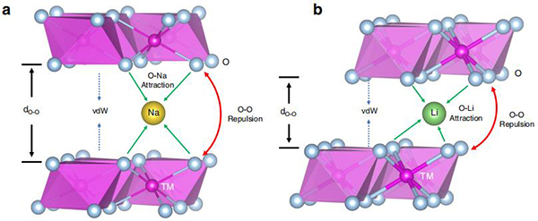 图一、静电相互作用(a,b)NaxTmO2和LiTmO2静电相互作用的示意图。