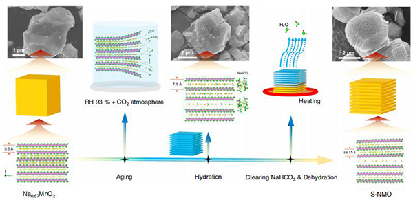 近日,厦门大学杨勇教授,王鸣生教授(共同通讯作者)以P2-Na0.67MnO2为模型材料,研究了Na+层间距变化对层状氧化物电化学性能的影响。具体来讲,本文提出了一种无害的水介导策略,以增加P2-Na0.67MnO2正极材料中的Na+层间距。所制备的样品具有页岩状结构(S-NMO)、手风琴状形貌和优异的电化学性能。无需进一步的电极/电解质修饰的情况下,S-NMO在0.1 C的倍率下可提供181 mAh g-1的高比容量,其100次循环后容量无明显衰减,同时倍率性能优异,且具有3000次的长循环稳定性,容量保持率为83%。