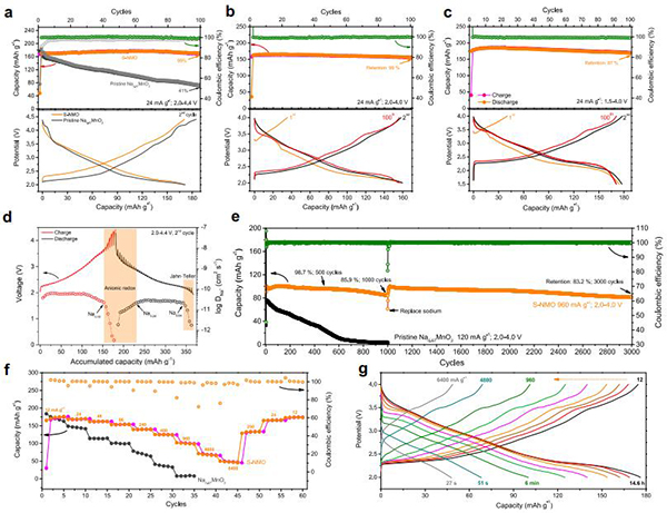 图五、S-NMO的电化学性能(a-c)在2.0-4.4V,2.0-4.0V和1.5-4.0V电压范围内,S-NMO电极在24 mAg-1下的循环性能和充放电曲线;