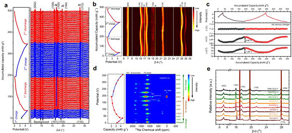 (a-d)在充放电过程中,S-NMO电池原位XRD,原位XRD等高线图,计算晶格参数和原位23Na MAS核磁共振谱;
