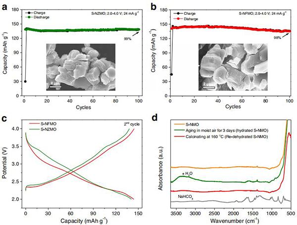 图七、水介导策略的优点(a,b)S-NZMO和S-NFMO的形貌和循环稳定性;