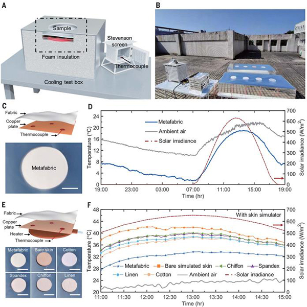 图三、超材料织物的降温性能测试(A,B)辐射制冷性能测试装置的示意图和照片;