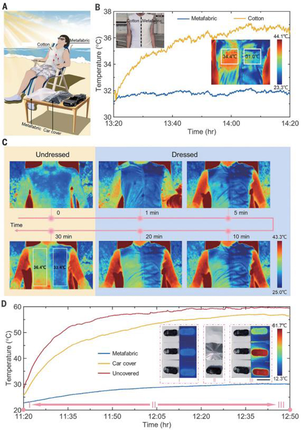 图四、阳光暴晒下超材料织物的实用性能表征(A)人体和汽车模型的超材料织物降温测试示意图;