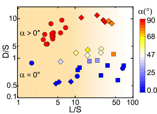图5. 统计所得自卷曲结构几何参数(D/S – L/S)以及对应的扭转角度。这里方形对应Ti纳米薄膜,菱形对应TiAlV纳米薄膜,圆形对应Cr纳米薄膜。