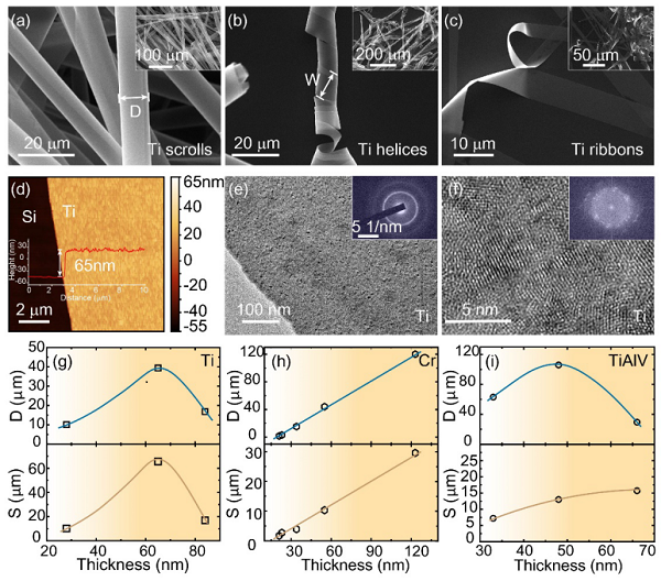 g)- i)不同材料包括(g)Ti,(h)Cr以及(i)TiAlV所形成的卷曲结构的卷曲直径和裂纹间距S随着纳米薄膜厚度的变化趋势图。