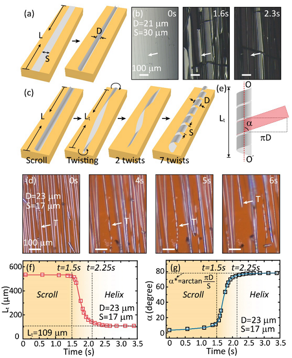 近些年来,纳米HTH官网地址 领域在不断涌现的新兴纳米制备方法的推动下持续向前发展,其中自卷曲纳米材料自从诞生以来便受到了极大的关注。最近的研究指出,通过自卷曲形成的纳米结构可用做多种纳米器件包括微纳发动机,微纳感应器以及各种纳米传感器等。然而,传统的自卷曲工艺所涉及的对中间层的腐蚀让材料剥离基底的过程十分缓慢(~1微米每秒),而腐蚀液的参与也限制了自卷曲纳米结构可以使用的材料种类。此外,自卷曲的纳米薄膜在卷曲的过程中会沿着不同的方向形成有有差异性的立体结构,而人们对这种卷曲结构分化的理解尚不清楚。因此,探索新的制备体系,以及推进人们在自卷曲底层机制方面的理解对未来制备更为复杂的纳米自卷曲结构具有重要的意义。