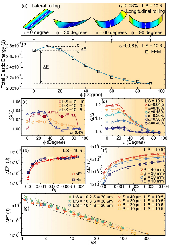 图4. 基于线约束模型的针对长方形自卷曲薄膜的有限元模拟。
