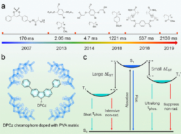 (b) 通过在PVA基质中掺入杂环多核芳香化合物DPCz来实现长寿命RTP系统的可行策略。