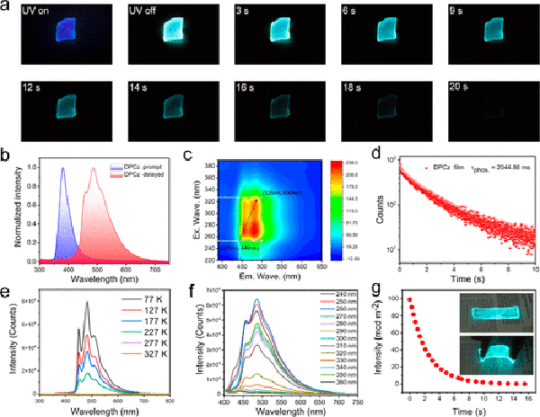 (g) DPCz掺杂PVA的时间相关余辉亮度衰减。插图:在太阳光下关闭 UV-254 nm 激发后磷光发射的照片。