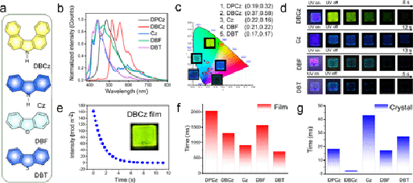 (f,g)比较DPCz、DBCz、Cz、DBF、DBT在(f)PVA薄膜态和(g)结晶态下的磷光发射寿命。
