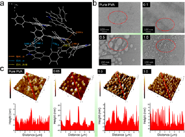 (c) 纯PVA薄膜和不同掺杂浓度(0.05、1.0、3.0 mg/mL)的DPCz掺杂PVA薄膜的三维AFM图像及沿红线的横截面分析。表面比例尺:5 × 5 μm。