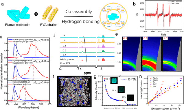 (f)优化的DPCz掺杂PVA晶胞模型。晶胞包括4个DPCz分子和60个PVA链(4-DPCz/PVA)。