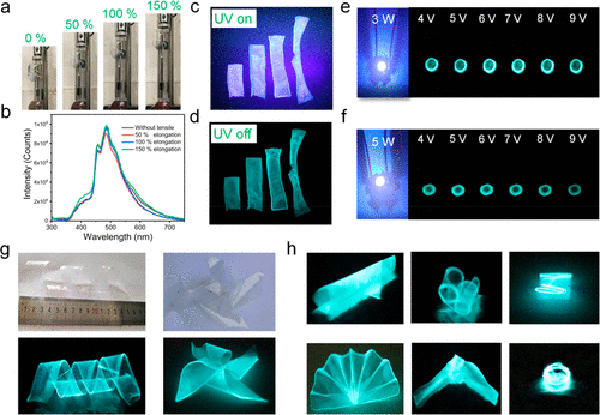 (a,c,d)在伸长0、50、100和150%后,具有不变的蓝色荧光发射(紫外亮)和绿色余辉(紫外关闭)的长寿命发光。