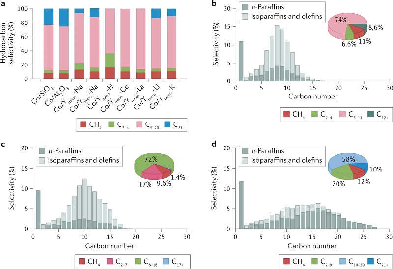 (a)传统Fischer-Tropsch 催化剂和介孔Y型沸石(Ymeso)负载的Co催化剂(Co/Ymeso)的烃选择性;