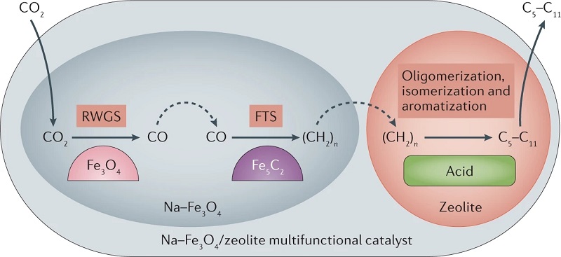图二、Na-Fe3O4/ZSM-5催化剂上CO2加氢制汽油反应流程