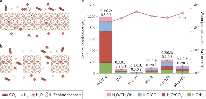 (a)通过无缺陷的Na-A沸石导水膜(WCM)的分子运输途径;