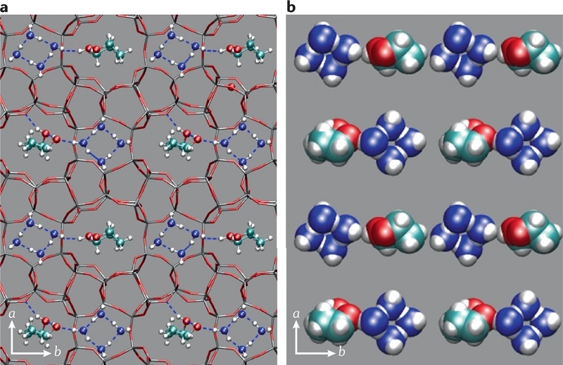 (a)镁碱沸石的骨架和由乙醇和水分子在0.84 GPa压力下形成的氢键网络;