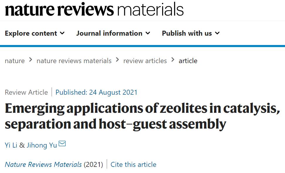 文献链接:Emerging applications of zeolites in catalysis, separation and host-guest assembly. Nature Reviews Materials, 2021, DOI: 10.1038/s41578-021-00347-3.