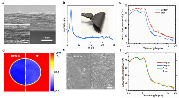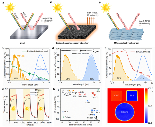 (e, f) MXene膜的高太阳吸收和低红外谱吸收特性。