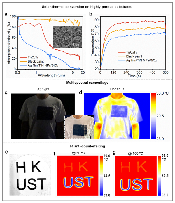 (a-b) 基于多孔基底的光热转换应用,在多孔尼龙基底上,MXene膜维持了很高的光谱选择性,而超材料失去了其选择性。