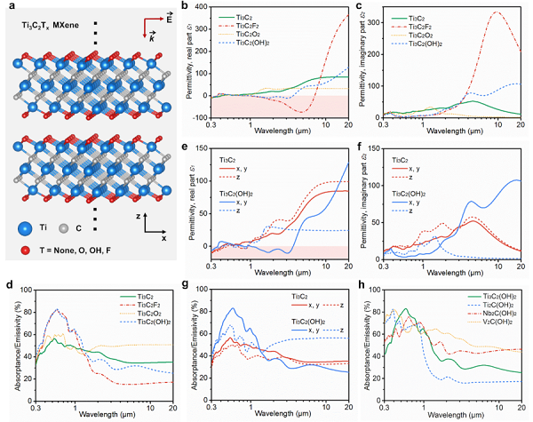 (e-f) Ti3C2和Ti3C2(OH)2 MXene 在x, y, z方向上介电常数的实部和虚部。