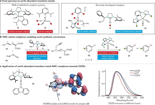 N-杂环卡宾(NHC)被归类为有机实体,其特征是在氮杂环系统内的价壳中只有6个电子的二价碳原子(因此称为卡宾)。与大多数碳系相比,NHC是一种稳定的化合物,通常可以分离和储存。大多数碳系本质上不稳定,在没有任何其他稳定特征的情况下,仅作为有机过程中的瞬态中间体存在(例如环丙烷化和C-H插入)。尽管N-杂环卡宾在三十年前就已经被分离出来并进行了表征,但它作为多功能、模块化和强配位的部分仍然引起了科学家们的兴趣。在过去十年中,由于对其行为的基本认识日益完善,新卡宾框架的出现和令人信服的可持续性问题,N-杂环卡宾在几个不同领域的利用率大幅增加。