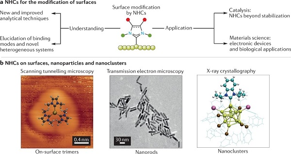 (b)NHC在金属表面(扫描隧道显微镜图像)、纳米棒(透射电子显微镜图像)和纳米团簇(X射线衍射结构)稳定的实例。