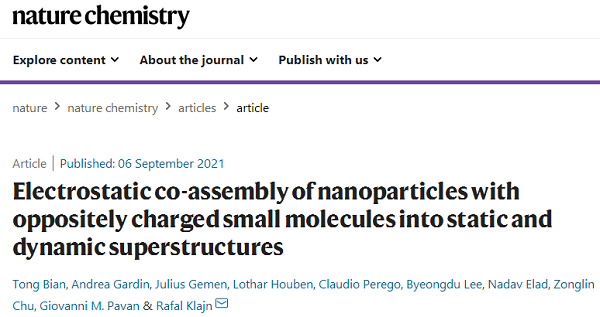 进日,以色列魏茨曼科学研究所Rafal Klajn团队发现带3个(或更多)电荷的小分子可以介导带相反电荷的纳米粒子之间的吸引相互作用,这些相互作用可以引导带电纳米粒子组装成以前只被认为是由它们与相同尺寸的带电纳米粒子共结晶形成的高质量胶体晶体。利用带正电荷的纳米颗粒和带负电荷的阴离子结合,可以生成瞬时纳米颗粒组装体。MD模拟发现,将NPs聚集在一起的寡聚阴离子表现为一种‘动态离子胶’,从而有利于NP聚集体的结构转变。本工作的研究结果为水环境中静态和动态纳米结构材料的制备和应用提供了方向。相关成果以题为“Electrostatic co-assembly of nanoparticles with oppositely charged small molecules into static and dynamic superstructures”发表在了Nature Chemistry上。