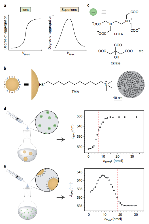 同样,由多个带电基团(典型的是COO–和NMe3+ )功能化的球形纳米粒子在许多方面表现得像简单离子的纳米类似物。这些‘超离子’可以作为电中性固体相互吸引,从溶液中析出,类似于简单的无机盐,如AgI。然而,小离子与带电纳米颗粒的行为存在一些显著差异。因此,寻找小分子来介导纳米粒子组装,将会对纳米材料的制备以及其在催化、传感和光子学等领域的应用提供便利。
