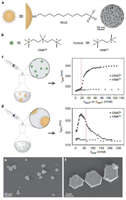 本工作接下来确定了观察到的自组装行为是否可以扩展到带负电荷的NPs和寡聚的‘反向’系统。为了解决这一问题,作者合成了含有磺酸基团(11 -巯基十一烷磺酸盐(MUS))的巯基的4.7nm Au NPs;值得注意的是,作者使用磺酸盐而不是羧酸盐端基,目的是保证最大程度的去质子化。作者在水中滴加OMA3+水溶液至MUS包覆的Au NPs (即Au·MUS)上,观察到S形滴定曲线,类似于Au·TMA与寡聚阴离子的滴定曲线。同样,用Au·MUS滴定OMA3+溶液也可以得到NP团聚体,且团聚体随着Au·MUS加入量的增加逐渐分解(图5d )。本工作在利用(NH4)2CO3提高离子强度的基础上,筛选出静电相互作用溶解的Au·MUS/OMA3+聚集体;而且,随之而来的是(NH4)2CO3缓慢分解,形成了规整的胶体晶体。