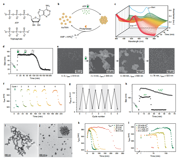 上述结果表明,携带三个(或更多)负电荷的小阴离子可以介导带正电荷的NPs之间的吸引相互作用,这些阴离子在单阴离子或二阴离子存在下仍然不组装。这些发现的基础上,作者假设,Au·TMA团聚体中“阴离子胶”电荷的自发减少应导致这些团聚体的解体。这种电荷减少可能是多电荷阴离子水解的结果。这样一个过程的一个主要例子是ATP水解——由磷酸酶酶催化的高度外能反应。因此,作者推断,在磷酸酶存在的情况下,ATP会作为短暂生成NP聚集体的刺激物。本工作发现,体系的平衡态对应ATP水解成AMP和HPO42-,两者均不诱导Au·TMA的自组装。但是,由于ATP水解比ATP诱导的NPs自组装慢,只要ATP浓度足够高,NP团聚体就会暂时存在。为了进一步验证NP聚物的分解是由吡啶酶的酶活性触发的,作者使用了一种不可水解的ATP类似物进行了研究。本工作发现,虽然这种寡聚体诱导了类似于ATP的NP聚集,但在酶的存在下,这种聚集并未出现解体的迹象。此外,反复循环导致溶液的离子强度逐渐增加,最终由于Au·TMA与寡阴离子之间的静电作用被屏蔽阻止NP的聚集。值得注意的是,在ALPase存在下,作者观察到Au·TMA聚集体的拆分轮廓截然不同,这取决于所用的阴离子。ATP和无机三磷酸的加入均使纳米粒子迅速聚集。然而,虽然Au·TMA/ATP聚集体在一定的时间内持续存在,之后迅速分解,但从P3O105-得到的聚集体在形成后不久就以稳定的速度进行开始崩解,直到几小时后再生出游离纳米颗粒的溶液。最后,作者假设非平衡NP聚集体的寿命可以通过外加刺激量来控制(图6d中的绿色)。图6k显示了随着ATP添加量的增加,λSPR值对Au·TMA的依赖性。NP聚集体在加入13.5 nmol ATP后约20 min开始快速拆解,而在加入刺激物后约180 min开始拆解(40.5 nmol)。结果发现,在某些组装体内部,ATP被迅速水解,需要不断地补充ATP,才能保持组装的非平衡状态。此外,本工作的系统允许一个独立的方式来控制动态NP聚集体的寿命,这是基于改变酶的浓度(活性)。