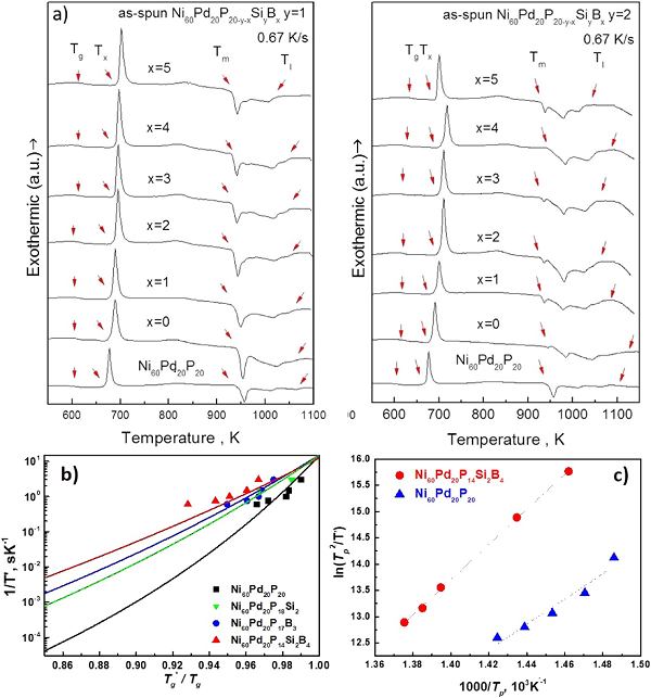 图1 Ni60Pd20P20-y-xSiyBx金属非晶合金的热表征。(a)升温速率为0.67 Ks−1时Ni60Pd20P20-y-xSiyBx的DSC曲线;(b) 热重归一化至Tg* (Tg*被定义为在加热速率为0.067 Ks−1时玻璃化转变的起始温度)函数的逆升温速率脆性图;(c) 基于Kissinger方程的Ni60Pd20P14Si2B4和Ni60Pd20P20的结晶活化能测量.