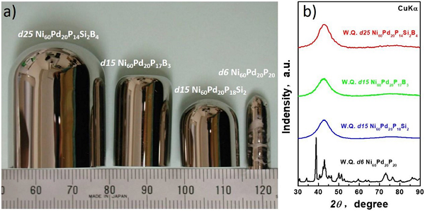 图3 水淬形成大块非晶玻璃试样.(a) 水淬试样的外观尺寸为Ni60Pd20P14Si2B4 (25 mm)、Ni60Pd20P17B3 (15 mm)和Ni60Pd20P18Si2 (15 mm)。图片中也显示了部分结晶的Ni60Pd20P20 (6mm)样品,供参考;(b)图(a)所示样品的XRD谱。