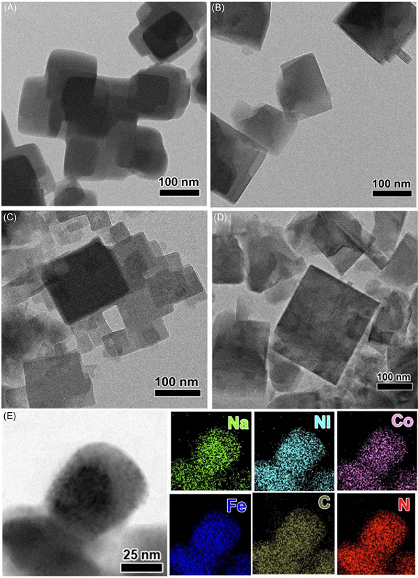 图4 (A) Ni–PB, (B) NiCo–PB, (C) NiFe–PB, (D)NiCoFe–PB形貌表征
